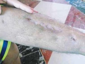 I asked them not to beat me because I am injured and I will answer all their questions, he said, adding , ” While I was answering  their questions,  one of them slapped me on the face strongly, then a headsman named “Abu Qasha’a” (nickname) stepped with his foot on the my broken thighs, and then he grabbed me at the base of fixing the nails and lifted me. I screamed until I almost lost consciousness. The wounds in my leg were sore and they sent me back to the hospital.”