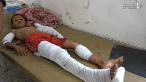 Earlier in the day, a child was killed and seven other civilians were injured when the coalition aircrafts targeted a car and a water truck on the main road in al-Khamis area of Mastaba district in the province.