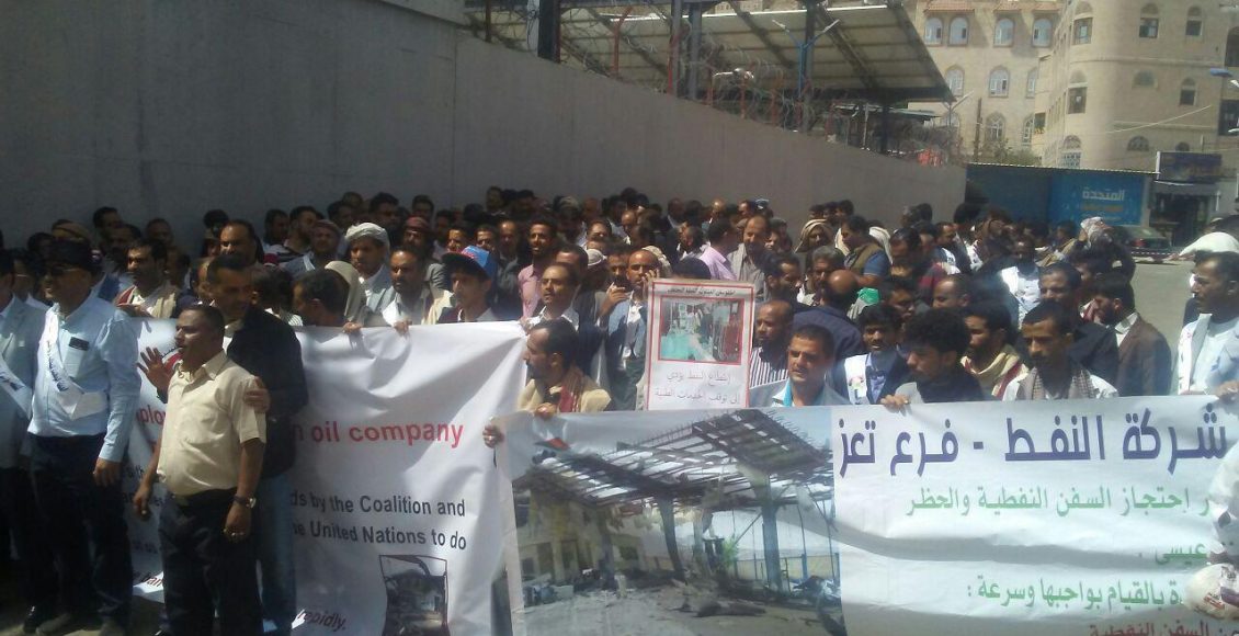 SANAA, June 23 (YPA) – A protest rally held in front of the United Nations office in Sanaa by the Yemeni petroleum company employees against arbitrary measures by the Saudi-led coalition in continuing to hinder ships carrying petroleum derivatives.
