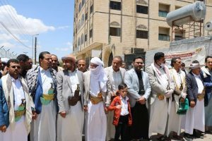 A statement issued by the protest called on the United Nations to assume its humanitarian responsibility towards the Yemeni people and put pressure on the aggression coalition countries to release the seized oil ships.