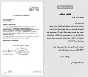 The bank document confirms that the amount deposited in the Al-Arad account, which is equivalent to USD 3, 523,957.06 Credit, as records at the close of business on 14/4/2020.