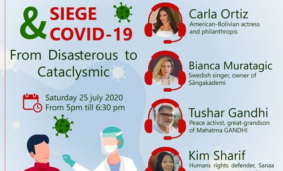 A part of our zoom seminar "Yemen between siege and Covid-19", with:Carla Ortiz, American Bolivian actress and philanthropist.Bianca Muratagic, Swedish Bosnian opera singer.TUSHAR Gandhi, peace activst, and great-grandson of the Mahatma GANDHI.Kim sharif, human right defender, and Sanaa government representative to the United Nations.Dr Youssef Al-haderi, spokesman of the Yemeni ministry of health.