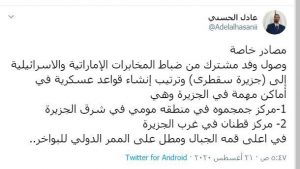 A leader of al-Islah, an ally of the UAE regime in the invasion of Yemen, revealed that a number of UAE and Israeli intelligence officers have arrived on the island of Socotra to make arrangements for the establishment of military bases in important and sensitive locations in the Socotra archipelago.
