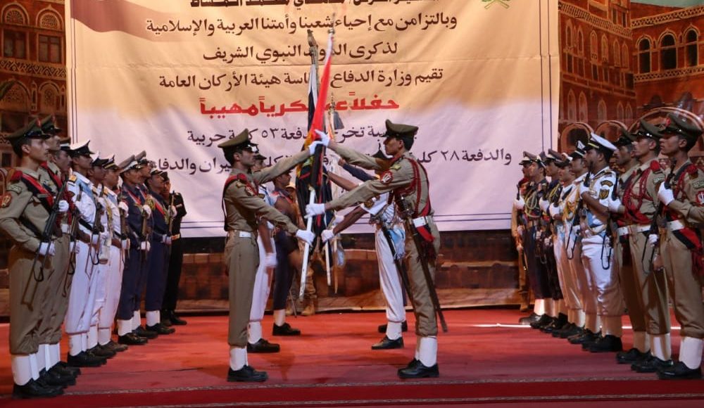 SANAA, Oct. 23 (YPA) – A military graduation ceremony was held in the capital Sanaa on Thursday, to honour newest graduates from three military collages ” Batch 53 of the Army College, Batch 28 of the Naval College, and Batch 35 of the College of Aviation and Air Defense, in conjunction with the commemoration of the prophet’s birth.