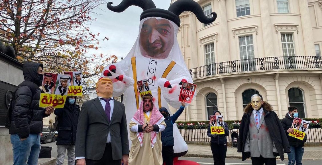 A giant balloon displaying a portrait of the Emirati crown prince was displayed as a symbol of the crimes committed by him, at which the demonstrators threw shoes while chanting slogans demanding freedom and justice for the victims of Bin Zayed’s crimes.