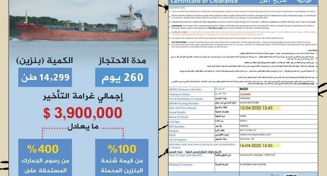 The spokesman of the Yemeni Oil Company, Essam al-Mutawakil declared that the total fines for delaying the seizure of the vessel “Miura” amounted to (3,900,000) dollars, confirming that the ship arrived to Hodeidah port and laboratory examination procedures are being completed to ensure that the materials meet the approved specifications, so that the unloading process can then begin.
