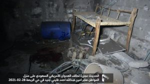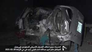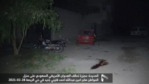 The Saudi-led coalition spy aircraft conducted three airstrikes on al-Rabbsah neighborhood of Al-Hawk district, targeting the home of Saber Amin Abdullah Ahmed, killing him, his son and his wife, and destroying the house, the official explained.
