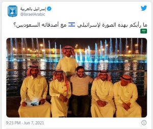 The account attached the photo to a question: “What do you think of this picture of Israel with his Saudi friends?”