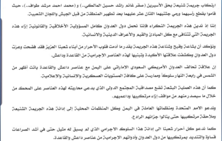 SANAA, Jul. 16 (YPA) – The National Committee for Prisoners’ Affairs on Friday condemned the heinous crime committed by Al-Qaeda and ISIS elements in which they beheaded two prisoners of the Yemeni army and popular Committees during the recent battles in Bayda province.