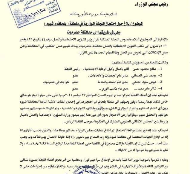 According to local sources, that Islah’s “special security forces” at Balhaf point kidnapped, on Saturday, members of the committee assigned by the Ministry of Social Affairs in the Saudi-exiled Hadi government to go to Hadramout province.