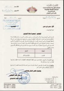 ADEN, Jan. 16 (YPA) – The Yemeni Petroleum Company in Hadi government has set a new price for oil derivatives in Yemen’s southern port city of Aden.