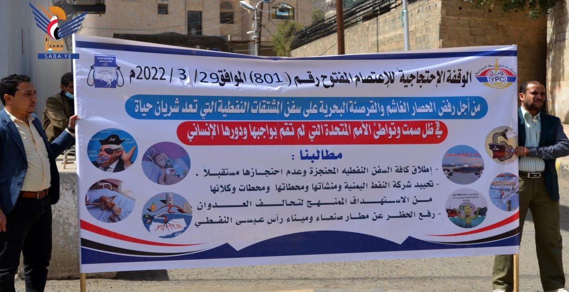The company’s staff issued a statement in a protest vigil in front of the United Nations office in Sanaa, calling on the international community and the United Nations to bear responsibility towards the coalition countries’ piracy on fuel ships and preventing their entry to the port of Hodeida.