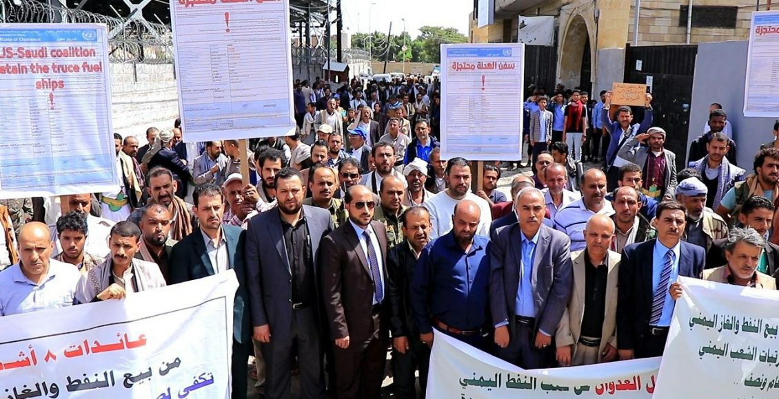 SANAA, Aug. 28 (YPA) – Dozens of Yemen’s Oil Company employees denounced in a protest rally on Sunday the shameful international silence regarding piracy imposed by the Saudi-led coalition forces on oil derivatives ships.