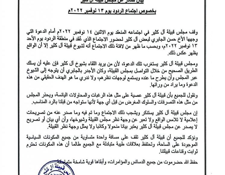 The council said in a statement on Tuesday the meeting of Al-Jabri in the responses in the name of the tribe did not touch reality and did not express the point of view of the tribe council and its elders, noting that any statement not issued by the Al Katheer Tribe Council being considered a distorted and false.