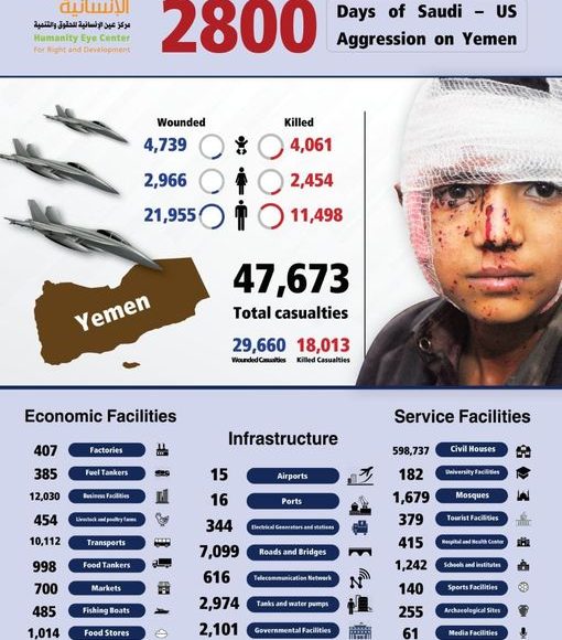 SANAA, Nov. 27 (YPA) – The Eye of Humanity Center issued on Saturday a report documenting the crimes of the US-Saudi-Emirati aggression against the Yemeni people during 2,800 days of aggression.