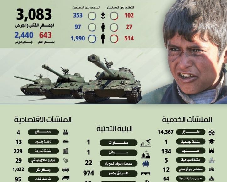 According to a report issued by the Center, the total number of martyrs and wounded reached 3,083, including 643 killed, including 102 children and 27 women. The total wounded reached 2,440, including 353 children and 97 women.