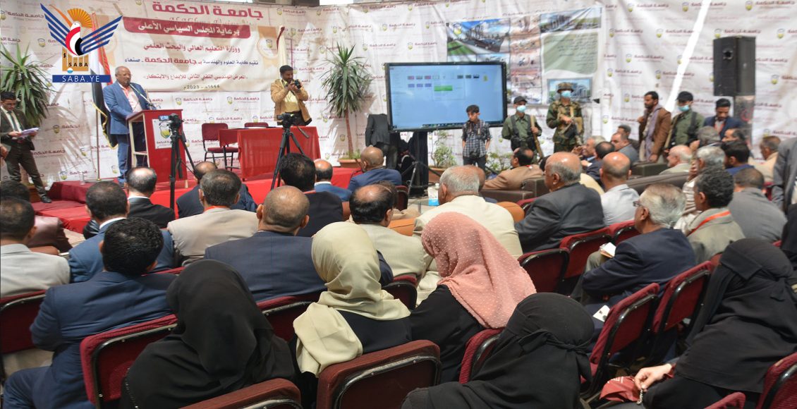The exhibition is organized by the College of Science and Engineering at Al-Hikma University, coinciding with the anniversaries of the martyr leader Hussein Badr Al-Houthi and the martyr president, Saleh Al-Sammad.