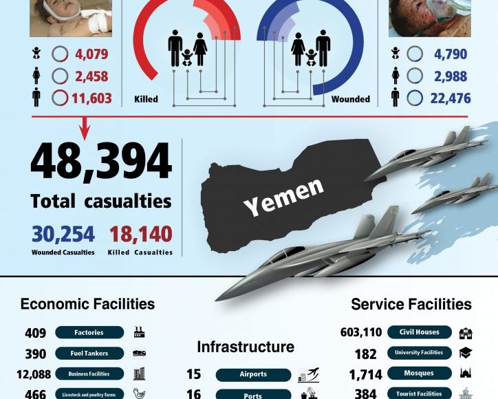 The center monitored the targeting of 603,110 homes, 182 university facilities, 1,714 mosques, 384 tourist facilities, 417 hospitals and health facilities, 1,265 schools and educational facilities, 11,350 agricultural fields, 141 sports facilities, 258 archaeological sites, and 61 media facilities by the US-Saudi airstrikes.