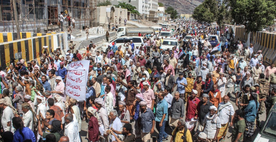 In a rally, which was held in front of Maashiq Palace, the protesters denounced the deterioration of the living situation, lack of services, and the continued collapse of the economic conditions in Aden and the southern provinces.