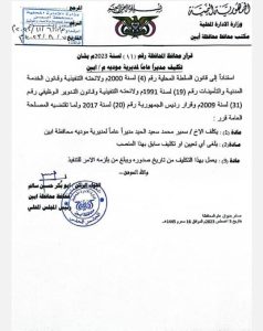 The sources published a document of an arrest warrant issued by prosecution of Mudiyah and Al-Mahfad against Samir Mohammed Saeed al-Haid, in early March, in addition to the document of his appointment.