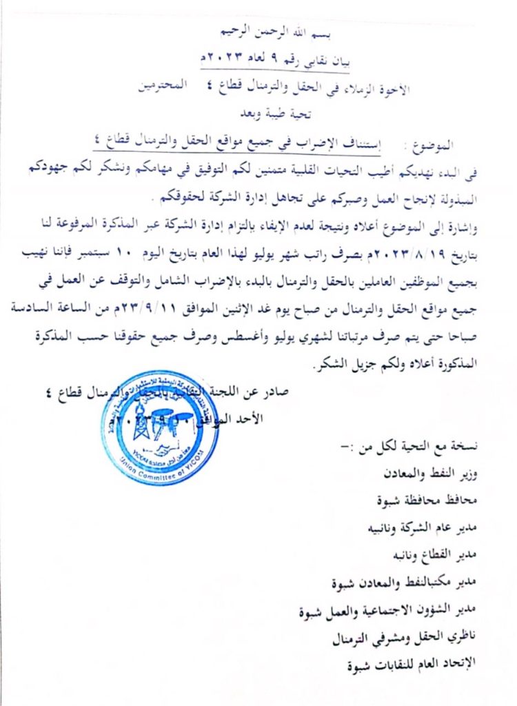 The Union Committee at the “Thermal” field in Ayath area of Jerdan directorate announced in a statement the resumption of the strike at all field sites due to the procrastination of the management of the oil investment company “Waycom” disbursement of their dues for the months of July and August last according to the agreement reached on September 10.