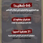 GAZA, Nov. 25 (YPA) -The Palestinian Journalists Syndicate announced the martyrdom of 66 journalists since the beginning of the Israeli aggression on the Gaza Strip on Oct. 7.