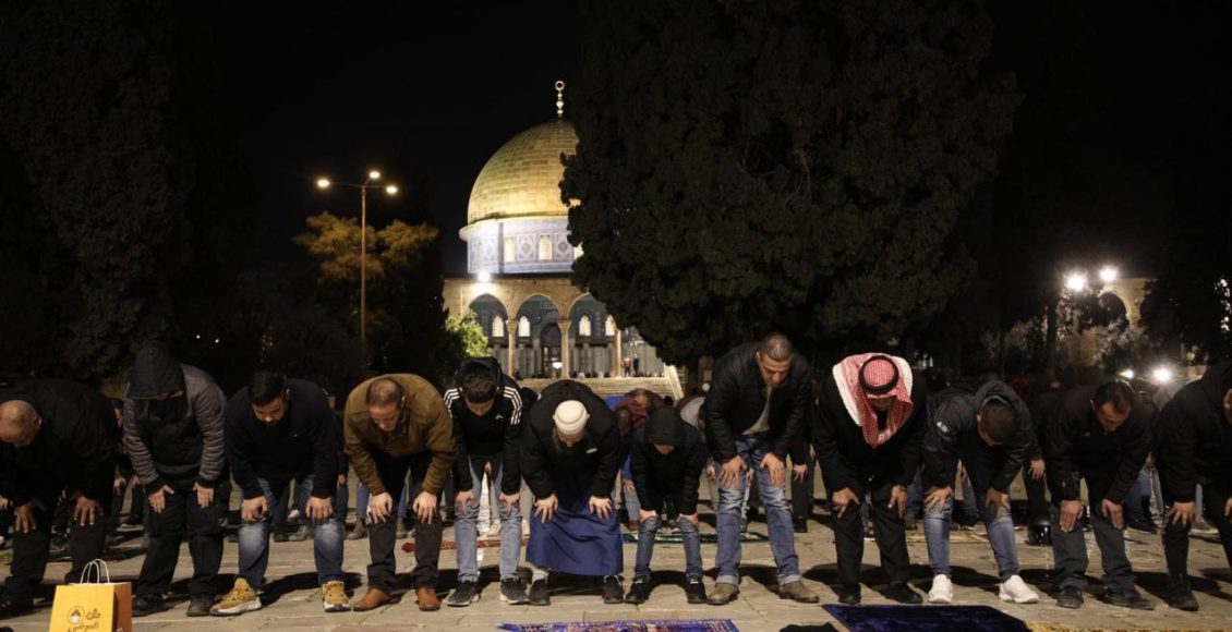 Thousands of Palestinians performed Tarawih prayers on Sunday evening in the Aqsa Mosque in Occupied Jerusalem, on the eve of the first day of the holy month of Ramadan.