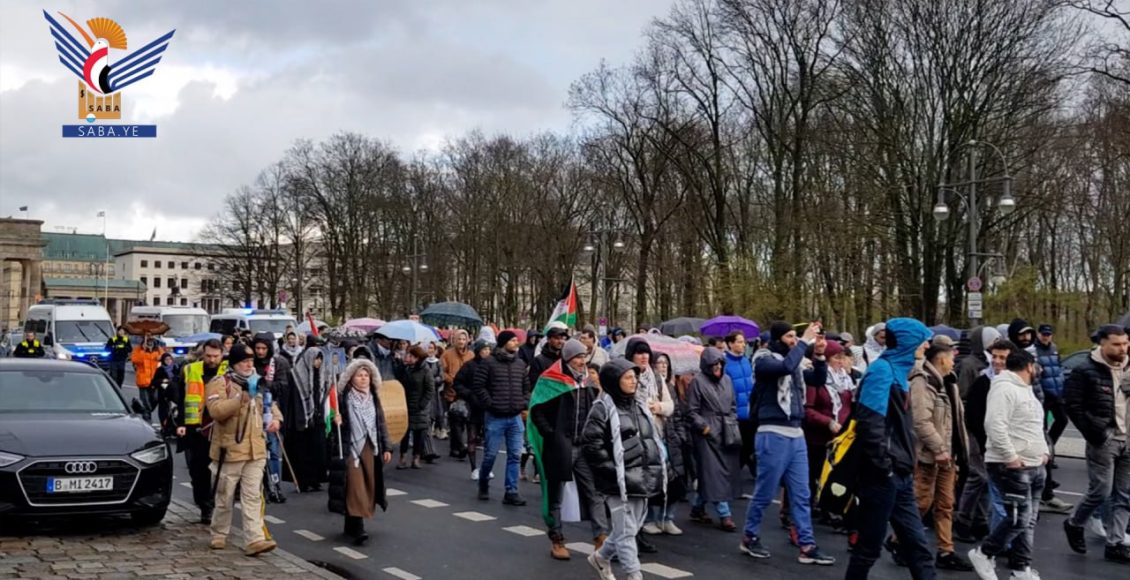 BERLIN, March 25 (YPA) -The Yemeni community in Germany in cooperation with the “Stop the War on Yemen” initiative and Insan Organization for Rights and Freedoms, organized a march in the German capital Berlin to denounce the ongoing Zionist-American-British aggression against Yemen and Palestine.