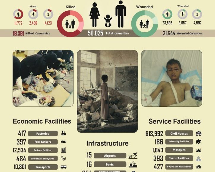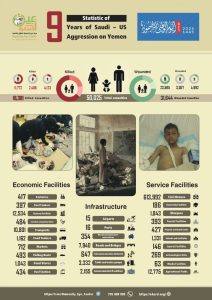 SANAA, March 26 (YPA) – The Humanitarian Eye Center for Rights and Development published on Monday shocking statistics on the crimes of the Saudi-led coalition over the past nine years.