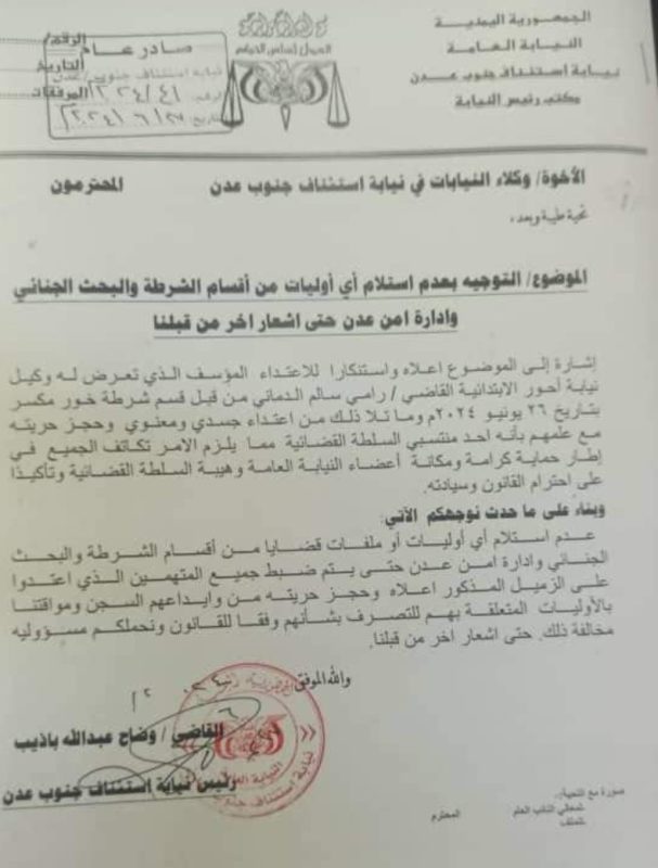 On Wednesday, the Chief Prosecutor of Aden, Wadah Badhib, called on all prosecutors in the Aden regions not to receive any preliminary documents or case files from the police and criminal investigation departments and the Aden security department, until the accused who assaulted the prosecutor of Ahwar district in Abyan governorate, Rami Salem Al-Damani, are arrested by armed elements loyal to STC in Khor Maksar Police.