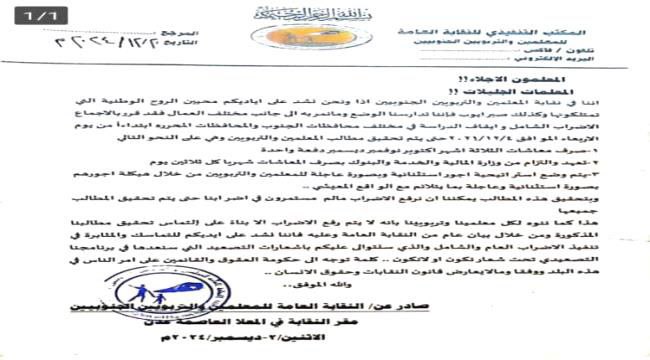 ADEN, Dec. 03 (YPA) – The General Union of Teachers and Educators, affiliated with the Transitional Council, called on teachers to go on a comprehensive strike in all schools in the governorates under the control of the coalition, starting tomorrow, Wednesday.
