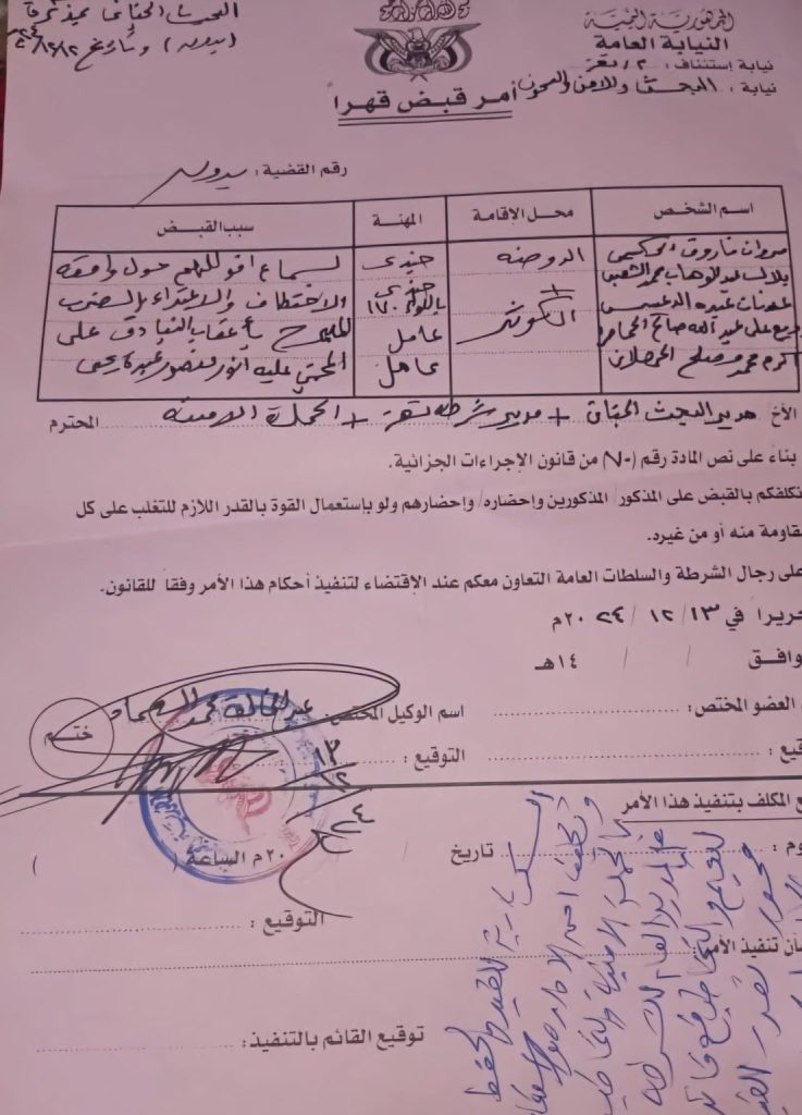 The “forced arrest” document listed the names of those accused of killing the expatriate Anwar Mansour Abdo Yahya last Thursday.