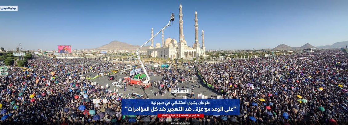 SANAA, Feb. 14 (YPA) – Millions of the Yemeni people took to the streets in the capital, Sana’a and other Yemeni provinces in mass rallies on Friday, reiterating their unflinching stance in support of the people of Palestine, their legitimate cause as well as the Axis of Resistance.