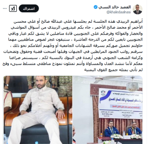 Al-Nasi explained in a post on the “X” that Aidarous Al-Zubaidi, the STC president, sought the help of leaders who have no political or military background, noting that they came from “livestock, vegetable, and fruit markets,” to be imposed on the southerners as leaders and models of struggle, while the rest of the people of the south are considered followers of lower ranks, according to his expression.