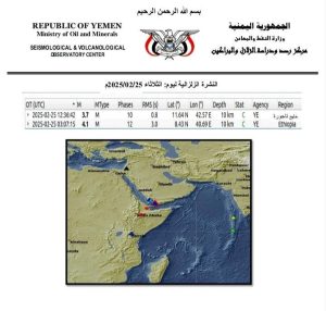 The seismic bulletin issued by the monitoring center in Dhamar province confirmed that its monitoring stations recorded a 3.7-magnitude earthquake at 3:37 p.m. in Tadjoura Bay, south of the Red Sea.