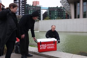 Video footage showed the water in the pool at the US embassy turning red, while Greenpeace shared several photos documenting the moments when dye was poured into the pool through boxes labeled “Stop Arming Israel.”