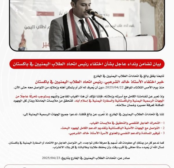 “We, the Yemeni Student Unions Abroad, express our deep concern and call on all Yemeni authorities to take urgent action to investigate the circumstances of his disappearance, to communicate with Pakistani security agencies, to provide full support for the search efforts, and to provide psychological and moral support to Al-Sharabi’s family,” the statement added.