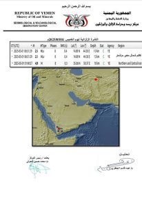 The head of the center, Engineer Mohammed Hussein Al-Houthi, stated in a post on his Facebook page that the first earthquake measured 2.5 on the Richter scale, while the second tremor measured 2.0. He explained that the two mild tremors occurred at 9:29 and 9:51 a.m.