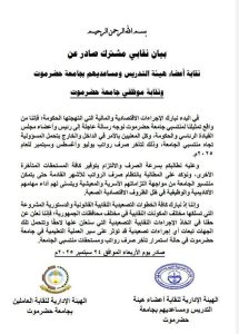 In a statement issued by the university’s teaching staff syndicate, teaching assistants, and administrative union, the need for regular salary payments in the coming months was stressed, to enable university employees to meet family obligations and carry out their academic and professional duties.