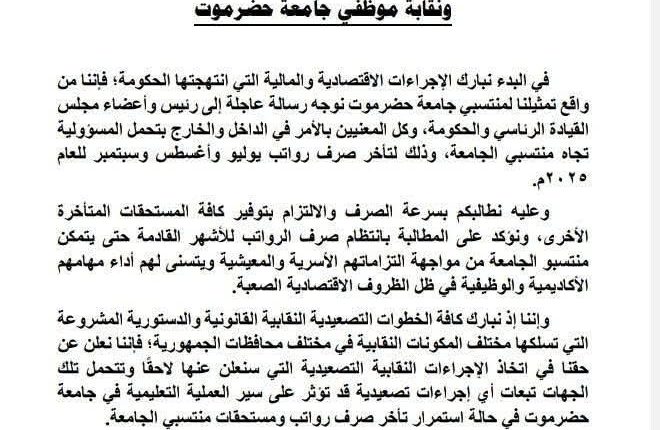 HADRAMOUT, Sept. 25 (YPA) -Hadramout University on Wednesday called on the government loyal to the Saudi-led coalition to immediately pay overdue salaries owed to faculty members and their assistants, warning that continued delays could disrupt the educational process.