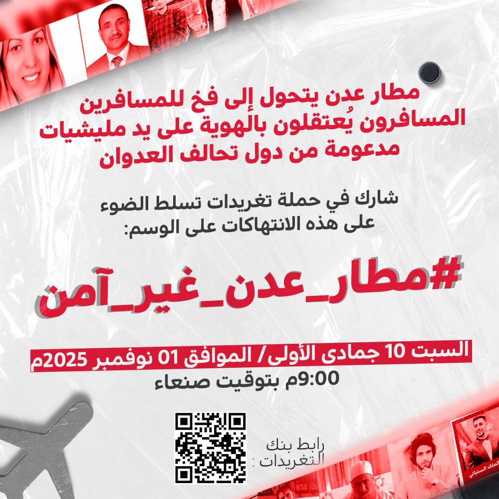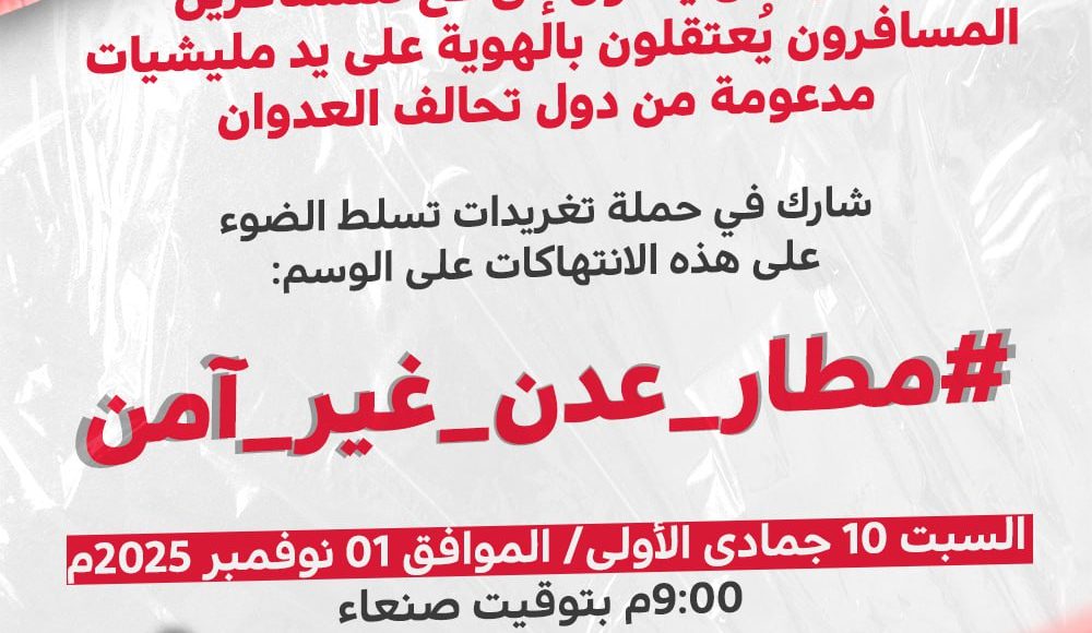 The campaign organizers called on the Yemeni public to participate widely to denounce the practice of arresting travelers “based on their identity,” using the hashtag: #Aden_Airport_Unsafe.