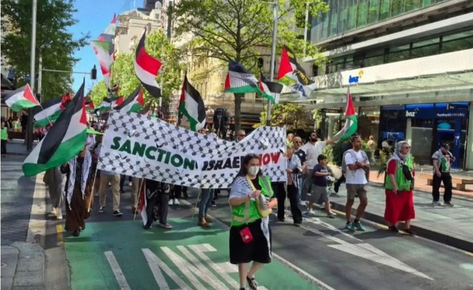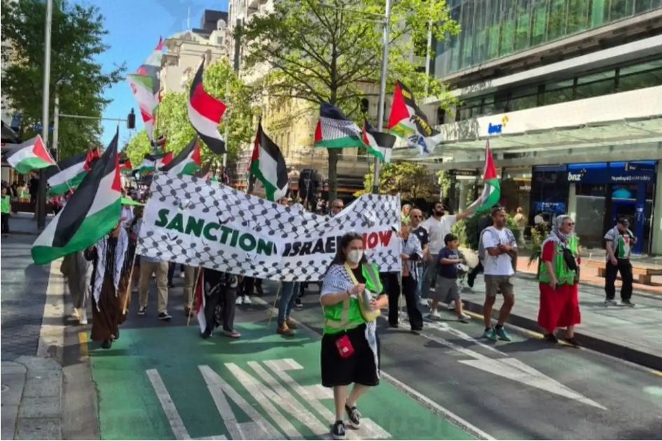 In the march, hundreds of demonstrators waved Palestinian flags and carried banners demanding an end to the crimes in Gaza and New Zealand’s recognition of the State of Palestine.