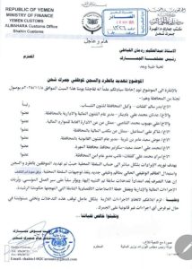 In an “urgent and important” statement addressed to Abdulhakim Al-Qubati, head of the Pro-coalition Customs Authority, Mubarak said a committee headed by Badr Kalshat, the deputy governor of Mahra affiliated with Islah Party, along with several provincial officials, demanded that customs revenues be deposited into the local authority’s account, amid threats of dismissal and imprisonment for employees.