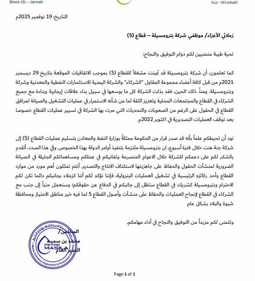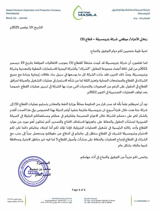 ADEN, Nov. 22 (YPA) – The oil company “PetroMasila” announced the sudden handover of Oil Block (5) in the Usailan district of Shabwa Governorate to “Jannah Hunt” company within one week, following directives from the Oil Minister of the government loyal to the Saudi-led coalition.
