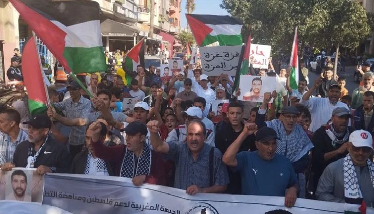 Participants raised slogans including: “From Tangier to our people in Gaza…You are the honorable ones of the nation and our intercessors on the Day of Judgment,” “Tell the normalization merchants, Palestine is Arab and Islamic,” “No retreat, no surrender, no capitulationist solutions,” “Loyalty to the blood of the martyrs,” and “A militant greeting to the proud Hamas.”