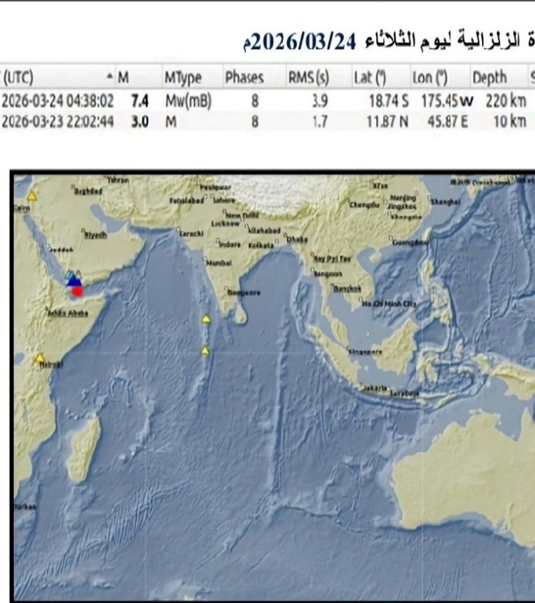 The center also reported that monitoring stations recorded another earthquake at 1:02 AM this morning, Tuesday, with a magnitude of 3.0 on the Richter scale, in the Gulf of Aden region.
