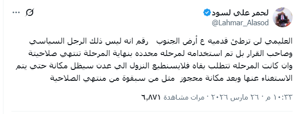 He also stated that Al-Alimi will remain in his position in Riyadh until he is dismissed, emphasizing that his place is “reserved,” just like those who preceded him and whose terms have expired, in a clear reference to Abd Rabbuh Mansur Hadi, Ali Mohsen al-Ahmar, and other leaders who were removed and placed under house arrest by the Saudi authorities in Riyadh.