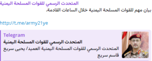 SANAA, March 28 (YPA) –Yemen’s Armed Forces to announce an important statement in the coming hours, the military spokesman, brigadier general Yahya Sarie wrote on his telegram channel.