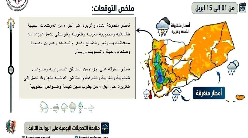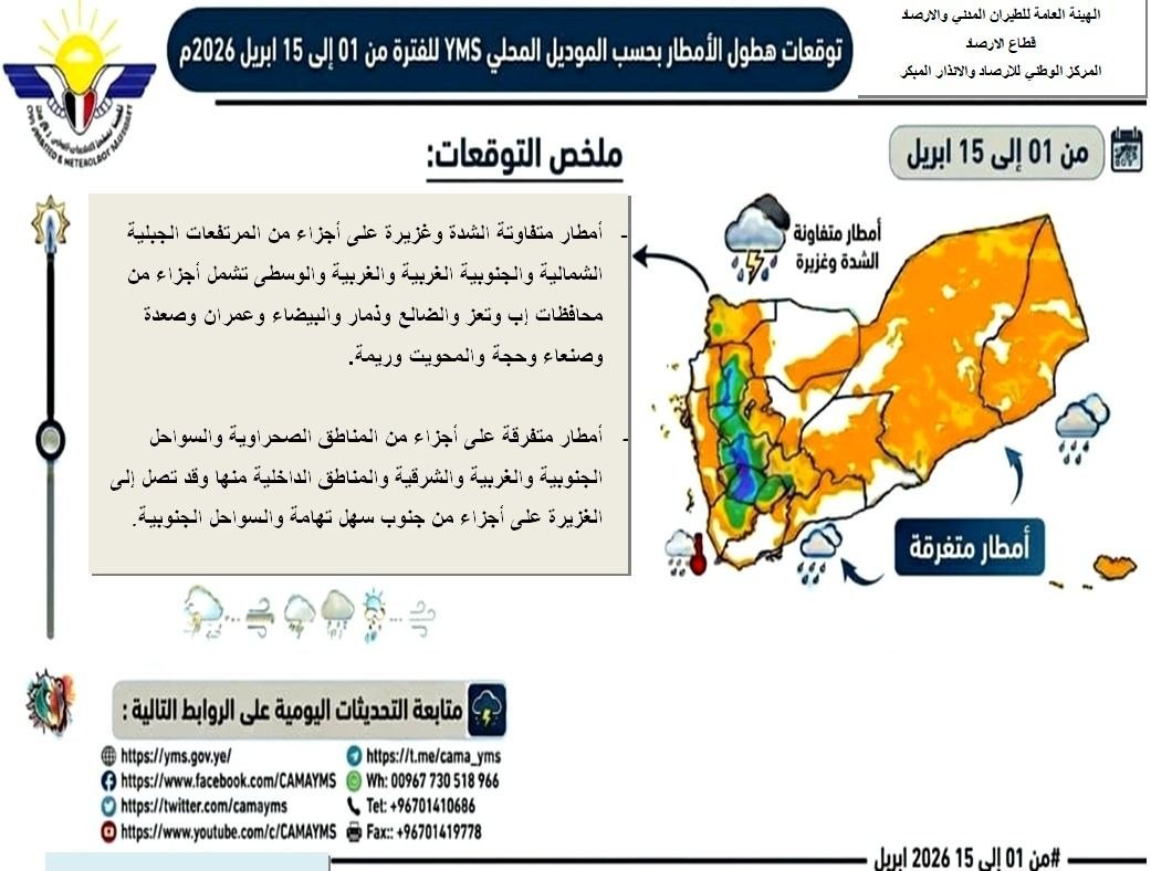 SANAA, April 02 (YPA) -The National Center for Meteorology and Early Warning has issued a weather alert regarding expected atmospheric conditions across Yemeni governorates from April 1 to April 15.