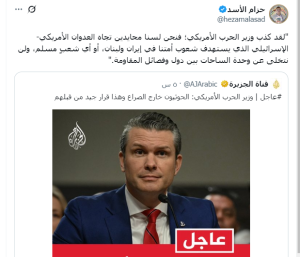 In a post on the “X” platform this Thursday, al-Asad asserted that Yemen is not neutral toward attacks targeting Iran, Lebanon, and Palestine.